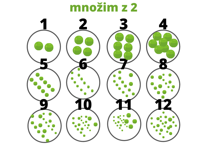 - Pripravite risalni list na katerega otrok nariše kroge (10 ali 12), ki jih označi od 1-10/12, na čisto zgornji vrh pa napiše število (1,2,3,..) s katerimi se bodo grahki množili