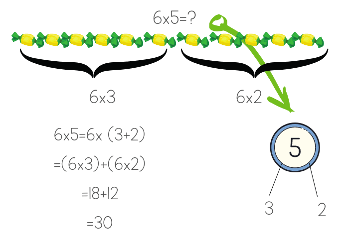 Na primer: za 6 x 5 lahko izračunamo tudi na “lažji” način: (6 x 2) + (6 x 3) ali 12 +18.